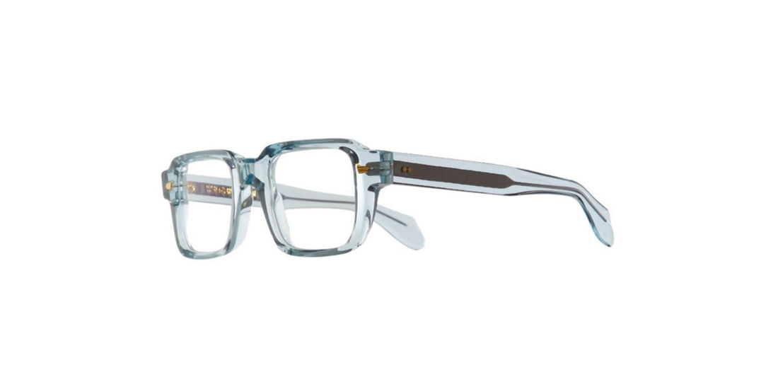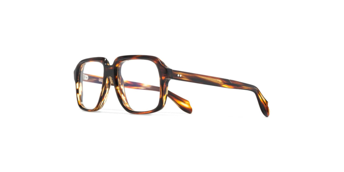 A smooth square shape acetate frame with square wing tip temples and and blue-light filter...